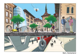 In Bern, a new digital wallet was introduced in which all residents are credited with mobility tokens at the beginning of the year. Tokens are deducted for every kilometre driven, depending on the means of transport and climate impact. Organisations also receive credit according to their area of activity. The tokens are tradable: Those who drive little or in a climate-efficient way save tokens that can be bought by frequent drivers. As a result, energy-efficient means of transport and public transport - now mostly sous terrain - have become even more popular. As a result, streets have been freed up and new pedestrian zones have become a feature of Bern's cityscape.