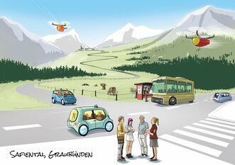 In our climate-neutral future, drones will buzz into the Safiental valley and supply even the most remote places in Switzerland with everything possible. Freight transport now runs autonomously and self-driving buses and hypernetworks also complement the public transport network very intelligently. The car-sharing aspect has also increased a lot in recent years, and so people are also sharing their cars in the villages.