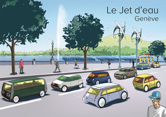 In Geneva, individual motorised transport has increased due to the promotion of electric vehicles. When the vehicles are not being driven, they are used to store electricity. Thanks to technological progress and the expansion of climate-neutral energy sources, Switzerland can now easily meet its electricity needs. Wind turbines dominate the landscape and solar panels gleaming in the sun complement the view of the Jet d'eau on Lake Geneva.
